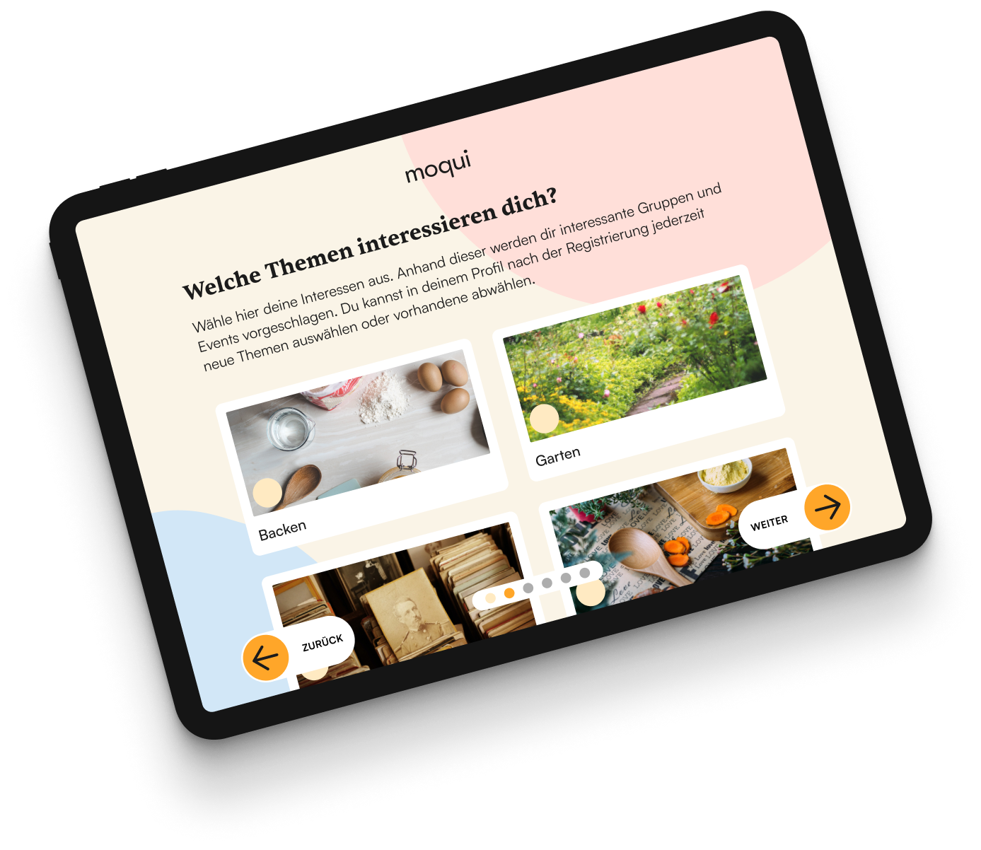 In Deutschland leiden schätzungsweise ca. 8 Millionen Menschen unter Einsamkeit im hohen Alter. Lang anhaltende Einsamkeit und Isolation haben schwerwiegende Folgen für die Gesundheit. Mit dem Ziel, eine (digitale) Lösung für dieses Problem zu entwickeln, ist das Projekt “moqui” entstanden. moqui ist eine Community-Plattform, die sich sowohl an junge, als auch ältere Menschen in unserer Gesellschaft richtet. Dort können sich Menschen anhand gemeinsamer Interessen in Gruppen zusammenschließen, über Themen austauschen und in einem sicheren Rahmen an Veranstaltungen in der Nähe teilnehmen. Dies ermöglicht älteren Menschen einen Kontakt mit jüngeren Personen, wodurch nicht nur die Einsamkeit bekämpft wird, sondern auch ein Wissenstransfer zwischen den Generationen möglich wird. moqui schlägt basierend auf angegebenen Interessen und dem eigenen Wohnort passende Gruppen und Veranstaltungen vor. Die App ist für die Nutzung auf Tablet-Geräten optimiert, um die ältere Zielgruppe bei der Bedienung optimal zu unterstützen. Große interaktive Elemente und eine gut leserliche Schrift tragen zur Barrierefreiheit bei.